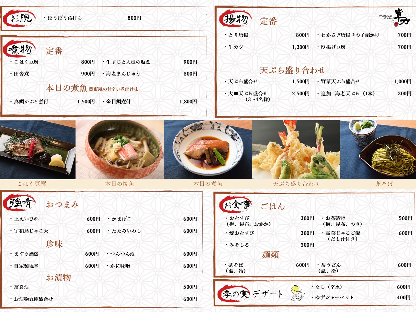 毎日替わるアラカルトメニューをご用意しております。もちろん、そのほかにも多彩なお料理がございますので、秋葉原の車力で満腹まで旬をご堪能ください。気軽なテーブル席もございますので、ちょっと和食でお酒を楽しみたいご気分の際も是非お気軽にお立ち寄りくださいませ。