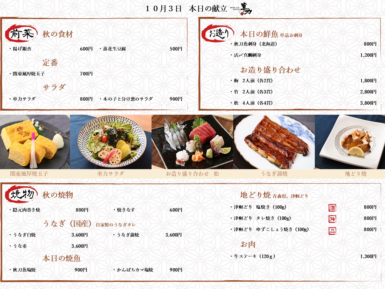 当店Facebook(秋葉原での和食・接待に「神田佐久間板前料理 車力」)でも当日の献立をご紹介させて頂いております。