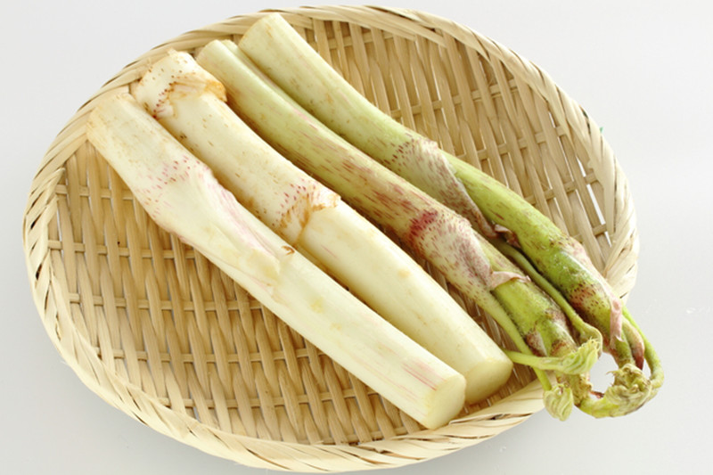 若葉、つぼみ、芽および茎の部分を食す独活。つぼみや茎は採取できる期間が非常に短く、今が旬です。もちろん若葉も「若葉」の内にいただくのがベスト、ということで、ちょうど初春が旬まっただ中というわけです。香りが非常に良く、一度食せばやみつきになる独特の味わいは、辛子酢味噌和でどうぞ。いやなクセや臭みが消え、美味しいところだけをお楽しみいただけます。
